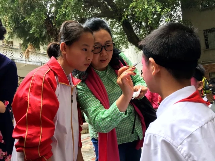 三位“梅花”指導學生畫妝。 ????“臉部畫妝的時候,應該注重輪廓的勾畫,展現出人物的氣勢。”、“臉譜色彩搭配要均衡,細節部分更要重視。”看到一旁正在進行表演前畫妝的同學,三位“梅花”上前一一耐心指導,為了讓學生們更快學習到畫妝的精髓,陳韻紅、崔玉梅兩人更是親自“上陣”,拿起化妝包,得心應手地給兩位小演員進行畫妝,同時還不忘手把手教給同學們一些畫妝的技巧。 ????“兩位老師很親切,還手把手地教會了我們不少技巧,原來大演員們也是那么隨和、那么平易近人的。”受教后的多位同學都這樣說。 ????精心指點、言傳身教