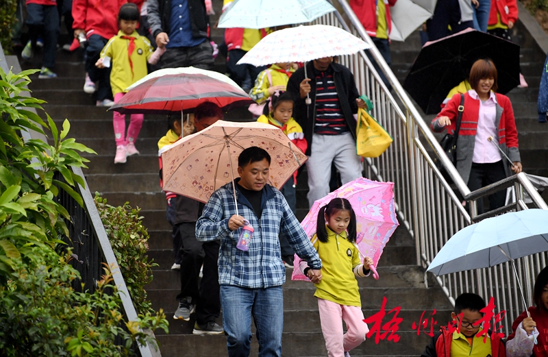 ??? 11月7日,在新興二路小學(xué)校門外,家長打傘接孩子放學(xué)。