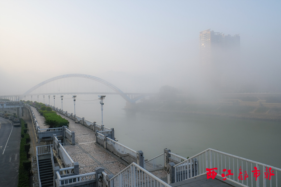 11月11日,濃霧彌漫令不遠處的鴛江大橋和鴛江一都若隱若現。