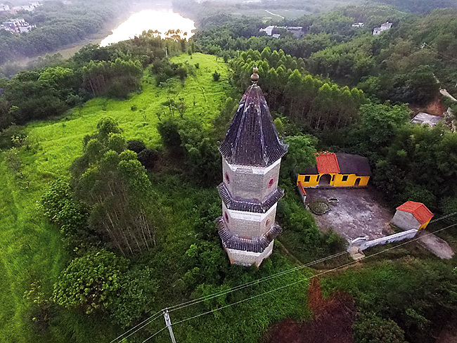 文筆塔歷經兩百多年風雨,依然屹立不倒。 文筆塔坐落在和平鎮都坡村的紫薇山上。我們涉過溪流,穿過野地,文筆塔的真容越來越清晰。只見草木葳蕤,層林疊翠,煙嵐彌漫的紫薇山頂上,一座古香古色的寶塔拔地而起,塔尖直指云天,活像一支倒插的大毛筆,“文筆塔”果然神形兼備! 與文筆塔毗鄰的是孔圣廟,廟堂莊嚴肅穆,外墻粉刷一新。跨進孔圣廟大門,邁過側面的“登科門”,文筆塔便觸手可及。抬頭仰望,頓覺文筆塔氣勢恢宏,雋雅古樸,偶有流風淡淡,如絲如縷的翰墨古香似在空氣中漂浮。文筆塔為六角空心三層磚木結構,高約17米,厚墻重檐,二三層留有觀光窗口,塔壁青磚錯縫疊砌,逐層縮級內收,塔頂呈錐形,覆以土瓦。地層和二層門頭分別雕刻著楷書“宏開文運”、“文昌閣”字樣。三層圓窗上方筑豎匾,內書“魁星樓”三字。塔身厚實的青磚歷久彌新,清晰的疊砌紋路,宛若它的年輪,一圈圈繞進了時光的足跡。文筆塔歷經兩百多年風雨,依然屹立不倒,實屬罕見。 由于古塔的木梯承重有限,我們分批登塔參觀。我佇立在文筆塔門前,聽文友們踏上木梯“咚咚”的足音,以及一陣陣嘖嘖稱奇的贊嘆聲,不禁陷入沉思:傳說,文昌本是天體中一個星座,文昌帝君又名梓潼帝君,為道教供奉的主宰功名利祿之神,文昌閣不僅是為祭祀文昌帝君,以保一方文風繁榮昌盛而建,更是當時文人雅士吟風詠月的風雅場所。怪不得和平鎮臥龍藏虎,人才輩出呢! 走進神秘的古塔,文昌帝君的神像與我碰個正面。他慈眉善目,長須飄飄,頭戴官帽,身披長袍,眉宇間透著儒雅的清氣,不由對其肅然起敬。帝君神像后是一幅麒麟奔跑圖,麒麟乃吉祥靈獸,素有“天上麒麟兒,地上狀元郎”之說,文昌閣藏麒麟圖,確是畫龍點睛之筆。可惜壁畫已斑斑駁駁,殘缺不全,褪落的粉末,猶如時間的碎屑,紛紛揚揚飄落歷史的長河。