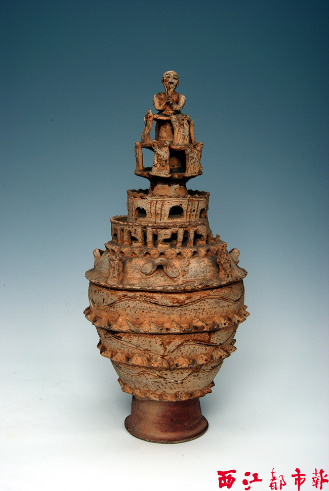 唐佛像塔形蓋陶魂罈 在櫥窗中,體型最高的唐群人像堆塑陶魂罈比較引人注目。該器物是國家二級文物,于1978年在梧州市旺步水廠鯉魚山出土。其通高68.4厘米,口徑16厘米,欄徑22.5厘米,腹徑31.5厘米,底徑16.5厘米。從這些測量數(shù)據(jù)就可以知道,這件器物的造型與構(gòu)造是相對復雜的。其整體呈梭形,兩頭尖,中間鼓,頂蓋呈塔狀,朝下斂口鼓腹,腹下漸收,底部呈喇叭形高圈足。器物肩部造型突出,堆塑著數(shù)十只形態(tài)各異、生動逼真的人像,人像背部呈幡巾帶狀,看起來似乎在描繪古時候出殯的儀仗形式。此外,器物肩部一道堆塑的鋸齒狀,以及腹部五道堆塑的水波紋也是較為突出的特點。 同樣頂部呈塔狀,肩部有堆塑鋸齒狀,腹部有堆塑水波紋的,還有唐塔形蓋陶魂罈與唐佛像塔形蓋陶魂罈。 唐塔形蓋陶魂罈同樣是1978年在梧州市旺步水廠鯉魚山出土,其通高55厘米,腹圍71厘米,底徑13厘米,造型相對簡單,且扁平。 唐佛像塔形蓋陶魂罈于1978年在梧州市富民坊紙箱廠出土,通高48厘米,腹徑21.7厘米,底徑11.5厘米。其頂部的塔狀尤為特別,是一雙手合在前的端坐狀、人物輪廓清晰的佛像,其下還有二層裝飾件,每個裝飾件又為小佛像,蓋沿則為一周高圍欄,內(nèi)為小拱形間以陰刻三豎線;除此以外,其肩部還堆塑一周直棱式窗間,上腹部飾四耳各間以一佛像,細節(jié)更為突出,裝飾更為細致。 從這些形狀各異的陶魂罈中,其背后墓葬者的身份差異、地位高低可見一斑。而同為陶魂罈,于1976年在梧州市富民坊太和沖出土的,宋朝時期的附加堆紋陶魂罈,則顯得較為樸素、簡潔,沒有佛像或人像裝飾,也沒有堆塑鋸齒狀,而下腹部的堆塑水波紋樣式更寬、更明顯。不同朝代陶魂罈的外形變化,似乎在暗示著經(jīng)歷不同時期的梧州人們,生活風俗也隨之發(fā)生了改變。 梧州市博物館陳列設(shè)計師陳睿介紹說,陶魂罈中的佛像、幡以及塔式造型等細節(jié),都帶有較為明顯的佛教色彩,這從一個側(cè)面反映出了唐朝時期佛教傳入梧州,對梧州當?shù)厝松铒L俗的影響。考古研究還發(fā)現(xiàn),陶魂罈中放置的很有可能是載有墓葬者信息的紙質(zhì)記錄,棲息在罈中的是逝者的靈魂,這與古時候的傳統(tǒng)墓葬方式有著明顯區(qū)別,這既說明了佛教對當時梧州人們思想觀念的影響,促使人們?yōu)橹淖儯脖憩F(xiàn)出了唐朝多樣、開放、包容的文化氣息,以及外來文化與本土文化的相互影響與碰撞。另一方面,陶魂罈的工藝制造技術(shù)與藝術(shù)造型,也反映出當時的梧州地區(qū)與外界有著密切的經(jīng)濟文化交流。 |