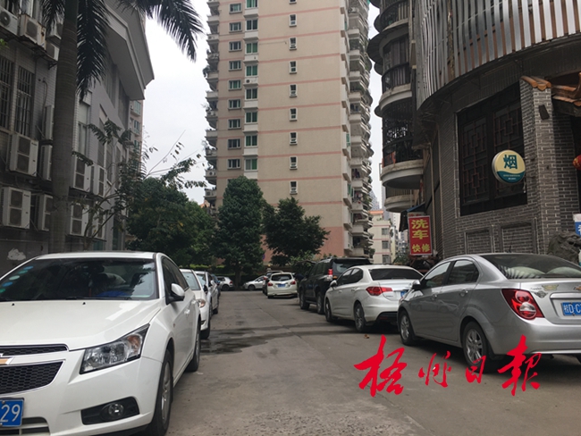 奧奇麗路通向工商新苑的路口,兩邊停滿了轎車。