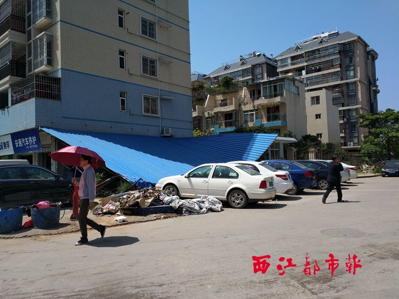 在豐業玫瑰園小區旁,被拆除的鐵皮棚及垃圾無人處理,小車亂停在人行道上。 西江都市報記者 蒙敏瑩 攝