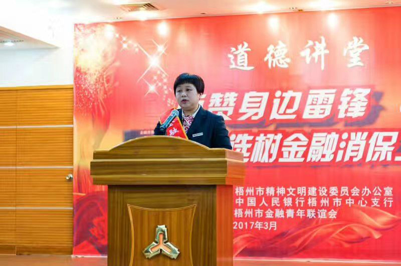 工商銀行梧州市寶石城支行大堂值班經理蒲勵從從一名普通柜員到大堂值班經理,一路走來,兢兢業業,始終憑著熱情真誠的服務態度,堅持“干一行、愛一行、鉆一行、精一行”的工作態度和職業精神,以飽滿的熱情、甜美的微笑、精湛的技能迎接每一位客戶,譜寫了一首“愛崗敬業、優質服務”的動人之歌。