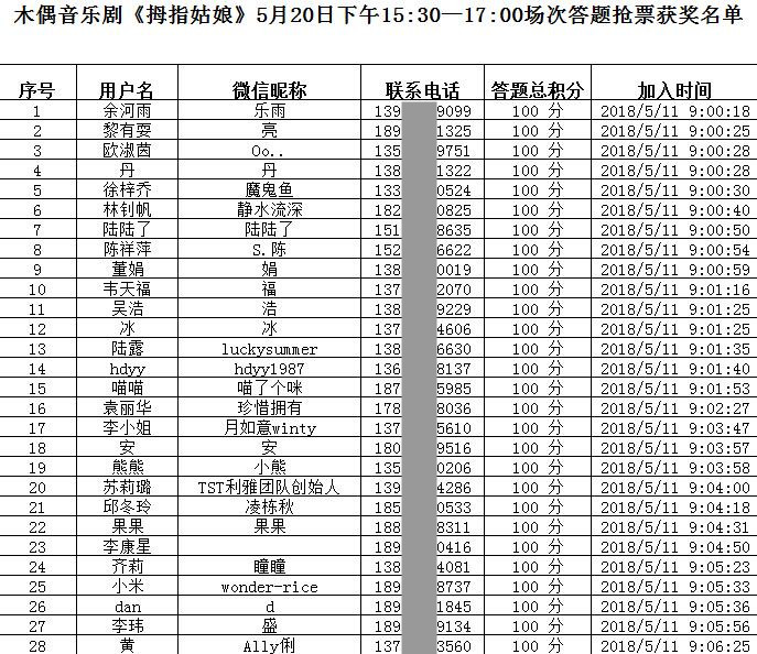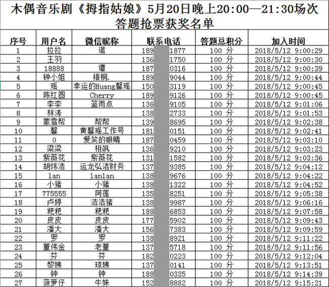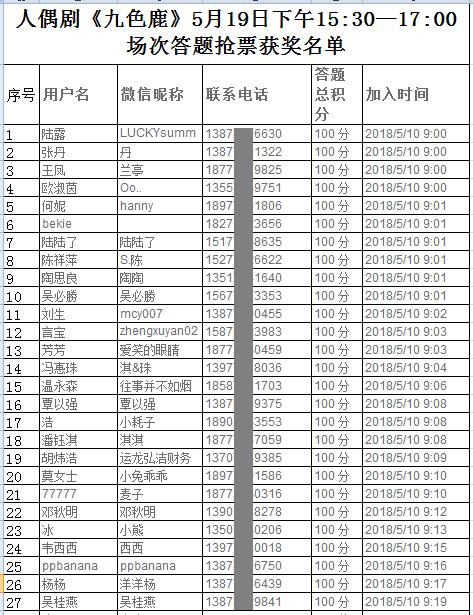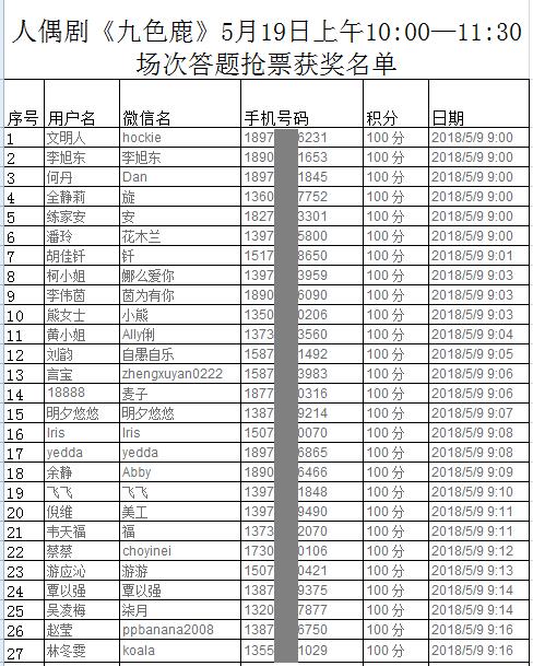 “悅賞精品戲劇傳承中華傳統(tǒng)文化”——2018年優(yōu)秀劇目走進(jìn)梧州市未成年人公益演出活動將于5月19、20日在市文化中心演出人偶劇《九色鹿》、木偶音樂劇《拇指姑娘》各兩場(共四場)。活動通過“文明梧州”微信公眾號“共創(chuàng)全國文明城市”答題搶票活動,向廣大網(wǎng)友贈送門票共1600張(每場400張)。各場次獲獎名單如下: