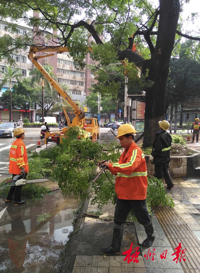 當天,受強降雨影響,梧州四中、廣東路等路段出現路樹斷枝和倒伏,相關路段的交通不同程度受阻。市園林綠化工程處快速派出人員到現場處置,清除倒落在道路上的樹木及其斷枝。黃超光 梁萍 攝