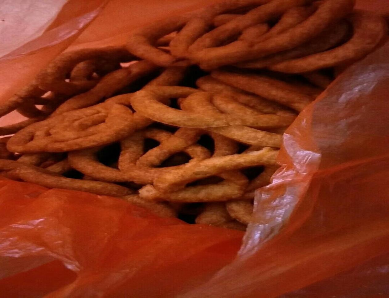 糖環全炸好了,等它不燙之后,奶奶還要找來干凈的白塑料袋裝好密封,這樣就能保持它的香脆。等年后走親訪友帶上一些,讓親朋好友也品嘗品嘗自己的手藝,共同享受豐收的喜悅。