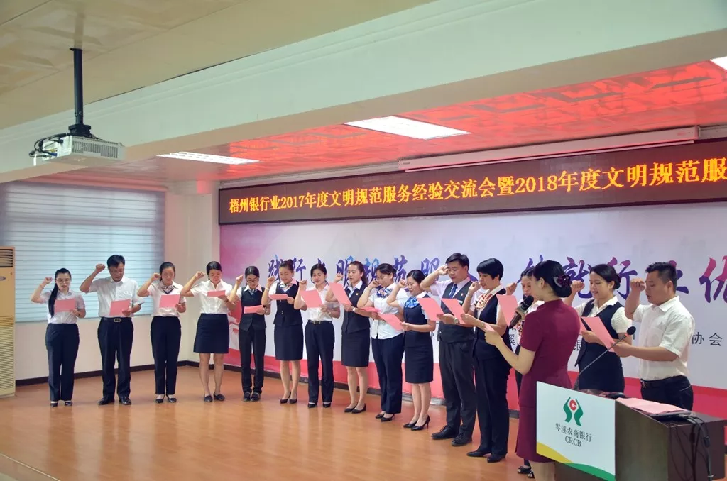 2018年度梧州銀行業文明規范服務系列評選活動正式啟動。 隨后,各銀行業機構代表在廣西岑溪農商行代表的帶領下,右手握拳舉起,進行了莊重而嚴肅的宣誓,他們宣誓并承諾:“將用心服務每一位客戶,真誠踐行每一份承諾,以優質服務贏得客戶滿意。”