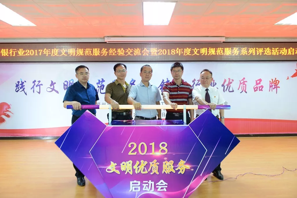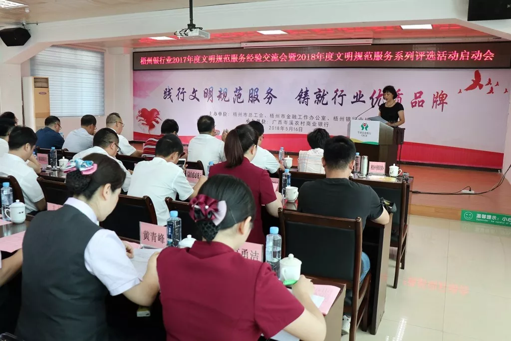 2017年度文明規范服務經驗交流會暨2018年度梧州銀行業文明規范服務系列評選活動啟動會現場。 廣西岑溪農商行董事長朱顯駒首先在會上致辭表示歡迎,他說,他們將以此次會議為契機,繼續與各會員單位一起,在梧州市總工會、梧州市金融工作辦公室和梧州銀行業協會的大力支持下,全面提升文明規范服務水平,鑄造梧州銀行業服務品牌,在轄區內形成爭先創優的良好氛圍,進一步推動文明規范服務工作再上新臺階!