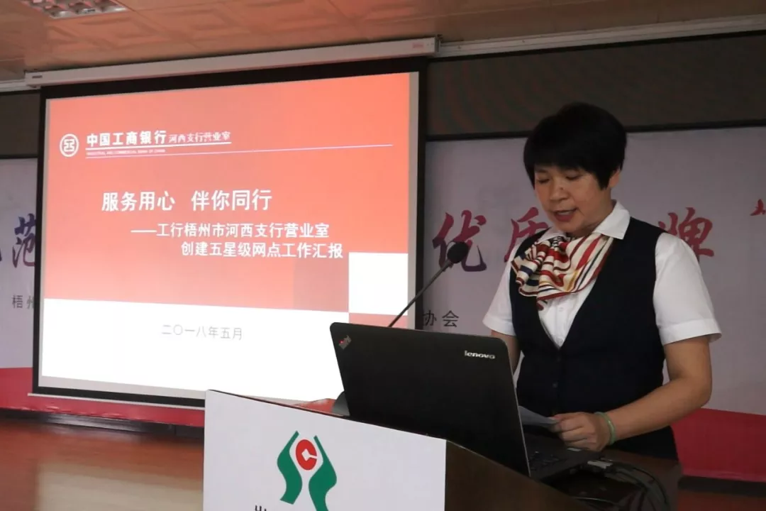 工行梧州市河西支行營業室代表作經驗交流。 2017年度中國銀行業文明規范服務“五星級營業網點”另一個獲得單位——農行灝景支行的代表自詡:“他們是一支年輕、團結、有活力的“螞蟻”團隊。”這名代表說,他們重視服務創建,努力為客戶打造優美環境,此外還注重肩負社會責任,下鄉、進校園送金融知識。