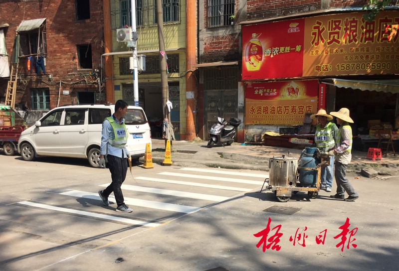 5月23日,工作人員在萬秀區建設路劃設過街橫道斑馬線。