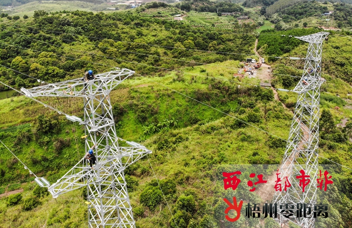 8月10日,施工人員在新建成的電力鐵塔上拉線。 記者 楊揚 攝 梧州零距離網(wǎng)-西江都市報訊 (記者 鄧發(fā)浩 通訊員 趙崧佑) 即將進行校飛工作的梧州西江機場項目周邊,有三條已經(jīng)使用多年的供電線路,為了給機場開辟安全寬敞的凈空環(huán)境,今年3月份,機場業(yè)主方開展了梧州西江機場配套電力工程,遷移供電線路。目前,該工程已完成建設(shè)。