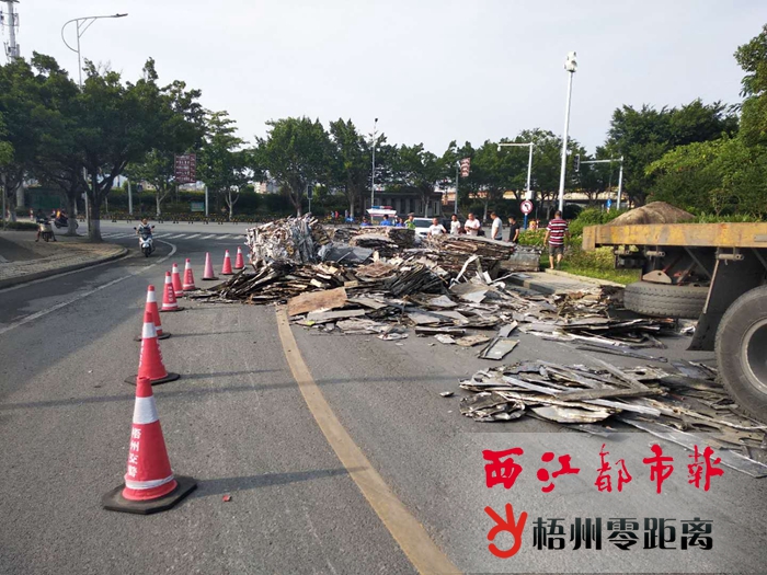 記者從梧州市公安局交警支隊長洲大隊獲悉,當天上午6時許,一輛重型半掛牽引車正運送廢鐵皮至廠家進行回收處理。或因車上的廢鐵皮沒有進行裝載固定,車輛通過西江汊河橋后轉彎下坡進入西堤路的引道時,車廂后部的廢鐵皮掉落路面,幸好當時車輛周邊沒有行人和車輛經過,未殃及行人或車輛。但由于掉落的廢鐵皮占據了大半幅車道,過往車輛只能靠邊緩慢通行。