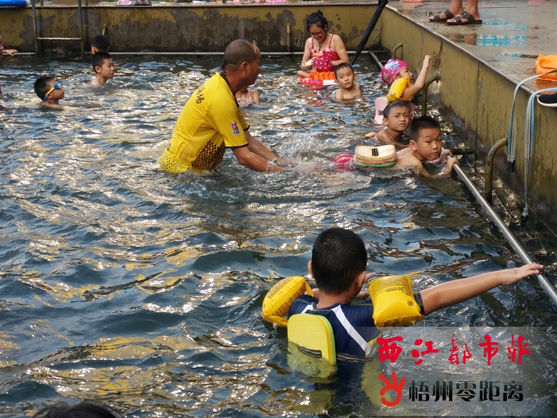 暑期孩子勤學游泳技能 8月10日17時許,位于桂江一橋附近的梧州市游泳場內人頭涌動。除了有市民在游泳外,也有不少家長帶著孩子到游泳場上游泳課。
