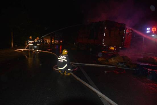 梧州零距離網訊 8月27日22時39分,一輛滿載紙皮的貨車途經G324國道梧州岑溪市歸義鎮路段時發生自燃,司機見狀后立即靠邊停車報警求救,梧州市消防支隊岑溪中隊迅速出警處置,所幸事故未造成人員傷亡。 事故發生后,岑溪消防趕到事故現場向司機了解得知,當車輛行駛至事故路段時,經后視鏡發現車上有火光閃爍,跟在后面的車輛不停地向他變換燈光鳴笛示意,他感覺情況不對,隨即將車??吭诼愤呄萝嚈z查,此時車上紙皮已竄出了火焰,火勢迅速擴散蔓延燃燒。