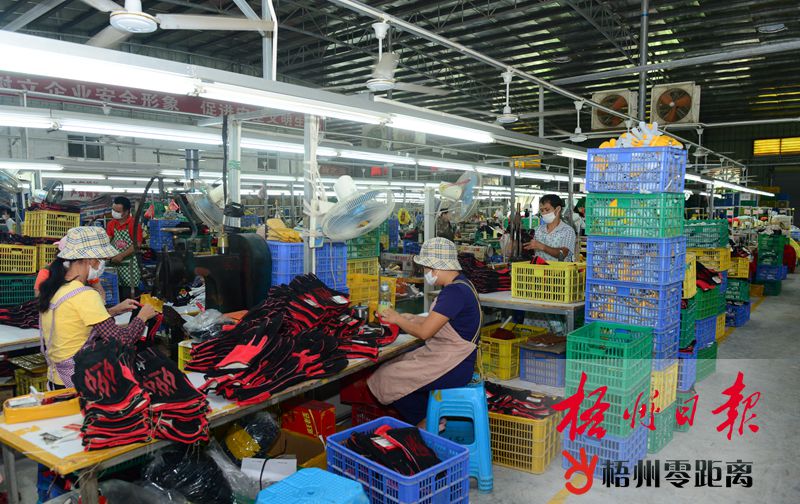 9月10日,在藤縣新慶鎮新慶手套廠,工人正在縫制皮手套。