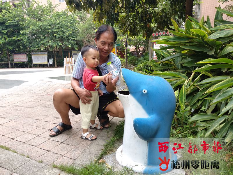 9月11日,藍天港灣住宅小區內,市民關延生引導孫子把礦泉水瓶放進垃圾桶里。 記者 吳艷虹 攝 9月11日,在藍天港灣住宅小區家風社內,市民關延生正帶著孫子小楚為一起閱讀愛護環境衛生的書籍,關延生邊看書邊對小孫子說:“這個小朋友把果皮扔在路上,這種做法對不對呀?”小楚為回答:“不對,要扔進垃圾桶里面。”從家風社出來后,爺孫倆一起在小區玩耍,當看到一個垃圾桶外掉落有礦泉水瓶時,小楚為指著瓶子對爺爺說:“爺爺,我們去把它撿起來扔進垃圾桶吧。”關延生夸贊道:“楚為,你真棒!” |
