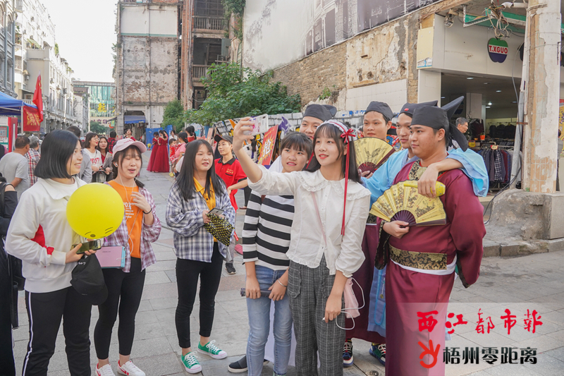 10月27日上午,微風吹拂著懸掛在街道兩側的吊旗、燈籠,精心裝扮過的中國騎樓城沐浴在晨光中,游客穿梭其間,仿佛置身于千年之前的古城梧州。10時半,騎樓城牌坊下,一陣激昂的鼓聲響起,“璀璨寶石·華服傳奇”梧州寶石文化·騎樓風情秀正式揭開序幕。 “擊鼓迎駕”后是浩浩蕩蕩的百人華服巡游。恢弘大氣的背景音樂在騎樓城中回蕩,仿佛鋪開了一幅“千年華服邂逅百年騎樓”的盛大畫卷。巡游隊伍從騎樓城牌坊出發,100名身穿華服的表演者分成兩隊沿著大南路款款行進,最后在主舞臺處匯合。 活動的主舞臺設置在特色小吃街路口,設計為古城樓造型。據相關記載,這個區域是梧州古城墻遺址的發現地,活動的設計也巧妙地還原了這個細節。 主舞臺的兩側,分為“上古”“下今”兩條街道。“上古”即大南路的上段,是以古建筑風格打造成的復古集市,匯聚了經營梧州特色食品如六堡茶、豆漿、紙包雞的老字號商家。茶鋪前,幾位古裝打扮的“伙計”大聲招攬著客人;“冰泉豆漿作坊”內,游客們親身體驗手磨豆漿;“大東酒家”又飄出香味,食客撕開包著紙包雞的玉扣紙的瞬間,香氣四溢。“下今”即大南路下段,是為自主創業的大學生提供的創意市集,學生們在這里擺賣一些自己設計的珠寶首飾、鮮花制品等。 萬秀區科技文化體育旅游局局長俞健說:“梧州城有2200年的歷史,我們在構思這次活動時,就考慮到了‘千年’這一元素,設計‘上古’‘下今’兩條街道相呼應,反映梧州城從古到今的變化。” 除一些靜態主題氛圍的布景外,現場還有許多創意游園式的表演。本次活動將持續三天,先后上演18個主題表演秀,游客能近距離觀賞“京劇+粵劇”的街頭創意表演、漢唐婚禮秀等特色演出。