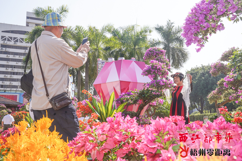 搭配寶石元素的寶巾花展區布置備受市民喜歡。記者 楊揚 攝 為了最大化地展現寶巾花的魅力,各參展單位精心布置展區,將小橋流水、瀑布、涼亭等元素融入造景之中,并配以各色時花,營造出一道道靚麗的風景線。蒼梧縣政府展示的《茶韻·蒼梧》,利用嶺南風格的建筑布景及蒼梧六堡茶文化元素,搭配品種豐富、造型各異的寶巾花,營造出“花香蝶自來,茶香人自品”的意境,吸引了不少群眾駐足觀賞。“六堡茶是我們蒼梧人的驕傲。這個茶壺倒茶的造型形象生動,與美麗的寶巾花‘融合’在一起,一動一靜,相得益彰。”來自蒼梧縣的群眾周德明說,“今天,我們一家老小都來看花,攝影設備都準備好了,一定要拍很多的照片回去慢慢欣賞”。