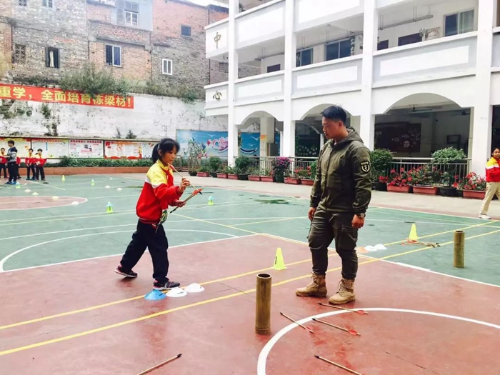 當(dāng)天下午,五坊路小學(xué)的30名3至5年級的學(xué)子參加了現(xiàn)場選拔,精神奕奕的隊員們認(rèn)真地聽著身穿迷彩服的教官講解選拔賽的挑戰(zhàn)項目,他們都迫不及待地想進(jìn)行挑戰(zhàn)。激烈的選拔賽在教官的一聲令下正式開始了,隊員們分成三小隊隊伍整齊地進(jìn)行跳繩、左右折返跑和投壺等第一輪比賽項目。這三項看似簡單的挑戰(zhàn)項目不僅集挑戰(zhàn)性和趣味性于一體,而且很好地考驗隊員們的平衡力、協(xié)調(diào)力和專注力。比賽一開始,隊員們就馬上進(jìn)入挑戰(zhàn)狀態(tài),隊員李鵬軒積極應(yīng)戰(zhàn),但他卻在投壺項目中遇到了難題,一共十支箭,前八支他都沒有投中。越是關(guān)鍵時刻他越?jīng)]有氣餒,沉著冷靜下來,在前八次中總結(jié)經(jīng)驗,把握投壺時的力度,在最后兩次連連投中,順利完成比賽項目進(jìn)入第二輪的挑戰(zhàn)項目。第二輪模擬射擊中,李鵬軒認(rèn)真聽教官的講解后掌握了一定的射擊技巧,面對距離十米遠(yuǎn)的靶,他率先第一個完成第二輪挑戰(zhàn)。“我非常期待接下來的比賽,希望能夠賽出好成績。”李鵬軒說,這些新奇的比賽項目很好地考驗了他的腦力和體力,在這次選拔賽中,他突破了自我,得到了鍛煉。經(jīng)過兩輪激烈的比賽,評委團最終選定了8名代表五坊路小學(xué)的優(yōu)勝“特戰(zhàn)少年”。