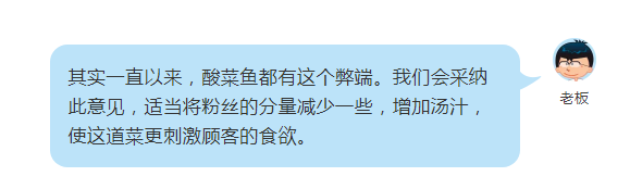 由于對私廚類餐廳的期待比較高,試吃團成員們褒貶不一、唇槍舌戰,比刺猬姐我還能說,一場美食江湖版的“吐槽大會”即將開始,想知道有多精彩嗎?那就往下看吧! 試吃團成員A:酸菜魚里的粉絲分量很足,但有一個壞處,就是粉絲會很快把湯汁吸飽發漲,使這道菜的品相大打折扣,我建議減少粉絲的分量,使湯汁漫過魚片。 試吃團成員B:酸菜魚的口味還不夠正宗,口味中欠缺了麻、辣、香,沒有讓我驚喜。其實一天忙碌過后,伴著酒肉,很多人點酸菜魚吃的目的是為了享受味蕾被刺激的感覺,但今天吃到的酸菜魚味道有些柔和,辣味不夠猛烈。