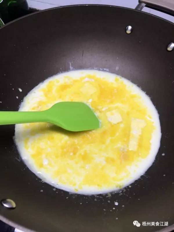 將蛋黃和白砂糖攪拌均勻,加入低筋面粉和杏仁粉混合均勻。然后,再倒入少許熱牛奶,快速攪打均勻后,將混合液倒入煮牛奶的小鍋中,用小火加熱,加熱時(shí)不停攪打,直到混合液細(xì)膩光滑。把煮好的混合液裝入碗中,刷上少許黃油,覆上保鮮膜。