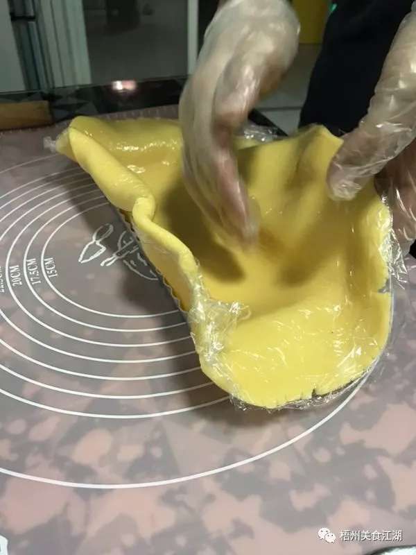 取出面團(tuán),搟開至薄度適中,入塔模,壓實(shí),用叉子戳些小孔。