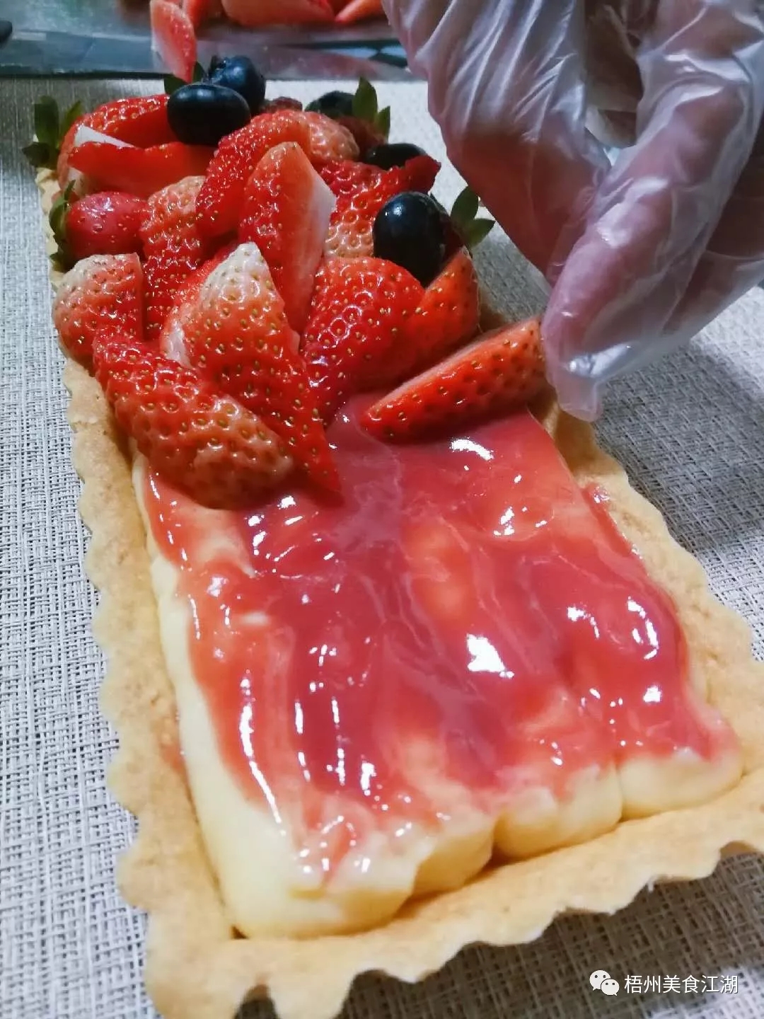 將草莓醬均勻刷在塔底,再將卡仕達(dá)醬擠入塔底中,裝飾上草莓,篩上些糖粉即可。