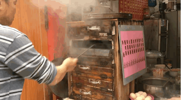 刺猬姐掐指一算,一份腸粉的整個(gè)制作過(guò)程大約十多秒,木蒸屜一共六層,每層蒸一份腸粉,這就需要黃師傅在“展示武功”的同時(shí),清晰地記得每一層的種類和烹飪程度,并在腦中計(jì)算,合理安排時(shí)間。想到這些,刺猬姐我禁不住要拍手稱贊了。 資深食客老吳告訴我,黃師傅最絕的功夫是制作雞蛋腸粉的動(dòng)作。于是刺猬姐專門點(diǎn)了一份雞蛋腸粉,只為欣賞這英姿。 黃師傅單手磕開雞蛋,打在圓盤上,左手向上一拋,雞蛋順勢(shì)滑上空中,再落回圓盤時(shí)已均勻地在腸粉上鋪開,黃師傅用迅雷不及掩耳之勢(shì)將圓盤滑入蒸屜里。不依靠手去打散雞蛋,而是利用重力使雞蛋落盤散開,這樣方便又快速。 此情此景,刺猬姐腦中想起一句古詩(shī):嘈嘈切切錯(cuò)雜彈,大珠小珠落玉盤。但這是專業(yè)動(dòng)作,請(qǐng)勿模仿哦!