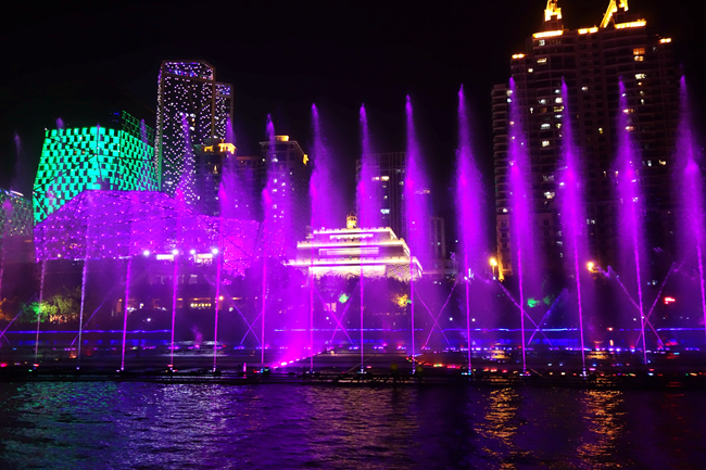 林細偉 文/攝 因同學聚會,我又回到熟悉而陌生的柳州。柳州地處桂中,是一座工業城市,印象中城市的天空老是灰蒙蒙的,街道與建筑物亦如此,像灰姑娘。然而,白天和同學走了一圈,感覺頭上藍天白云,街道整潔美麗,許多舊建筑已換了新顏,高樓林立卻又高低有致,更感舒適方便的是柳江上增加了數條大橋。同學告訴我:“你一別柳州二十年,變化大著咧!今晚咱們來自天南海北的同學,一起游柳江吧,一定會刷新你記憶中的柳州。” 入夜,華燈初上,在柳江東門碼頭等候上游船的地方擠滿了人,岸上看下去黑壓壓的一片。幸好我們上午就買好了票,我們順利登上百里柳江游船金龍號。這些游船每晚開兩個班次,八點一班,九點一班,游程約一小時,從紅光橋至壺東大橋游一圈,從南岸到北岸逐個景點游覽,然后由北岸返回南岸,回到渡口。 我站在甲板上遠望北岸燈光璀璨,各個建筑物高低不一,錯落有致,建筑外殼都裝有燈飾,五彩繽紛。數只游船在江邊緩緩而行,裝點美麗風格各宜的游船和漂亮的建筑物相互映襯,構成了一幅多彩多姿的柳江夜景圖。 待游客上船完畢坐定,游船轉身離岸徐徐駛向北岸。剛才望見還是平靜的北岸江水,待游船駛到眼前卻突然變了樣。隨著輕音樂的響起,數百條上千條的水柱騰空而起,水柱由小到大,由低到高,如一片雨林,水面翻騰起來。水柱隨著聲響的變化而變化,水柱忽兒如火箭直夜空,忽兒像芭蕾舞女,翩翩起舞,忽兒似仙女散花,無數水花從空中飄下,水花甚至飄到游船的游客頭上。幾個游客激動得驚呼起來:“水花飄落到頭上啦!”這時,船上所有的游客眼睛都盯在這片長長的音樂水域里。我身邊的一對情侶緊緊地依偎在一起享受著水花帶來的清涼與美景。親密的情侶相依相偎,讓我感覺周圍蕩漾著幸福的氣息。我再看岸上的建筑物已經變換了顏色,水上景物與岸上景物,在音樂的伴奏下自然融合在一起,美輪美奐,美不勝收。音樂聲響時大時細,聲調時高時低,慷慨激昂而又悠揚動聽,令人陶醉。同學告訴我,柳州市政府下決心把柳州打造成一個環境幽雅的工業城,眼前看到的是亞洲最大的水上音樂噴泉——柳江大型水上音樂噴泉,噴泉位于柳江大橋與文惠橋之間北岸的柳江江面,全長315米、寬10米,設有832套噴頭,噴泉開噴時噴出的水景最高達100米。
