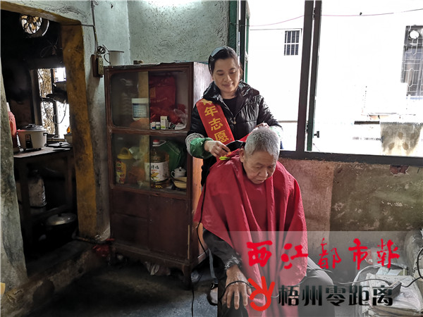 圖為3月5日,萬秀區東正社區聯同“雙報到”單位,組織志愿者上門為老人理發。梁轉明 攝