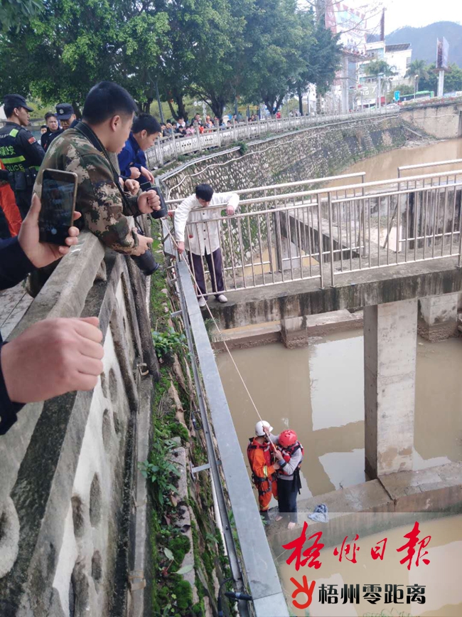 連日降雨導致岑溪市義昌江水位暴漲,當日,一名陸姓七十歲老人捕魚時漁具被洪水沖走,于是順著一根繩子從岸上下到江邊想拉回漁具,但由于水流湍急而未果,自己還被困在江邊,冷得瑟瑟發抖。接警后,岑溪警方和消防部門出去救援,一名消防員順著繩子下去將老人接住后,由岸上人員將其拉上來。 龐廣蛟 攝