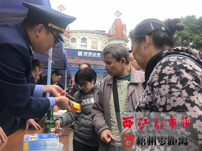 活動現場,梧州市市場監督管理局的執法人員指導群眾如何辨別假冒偽劣產品。 記者 謝韻 攝