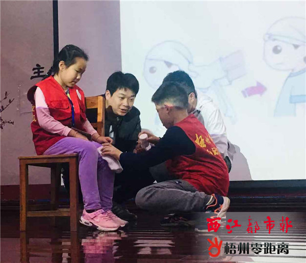 “哪位小記者能給大家示范簡單包扎的方法?”通過學習指導,何暉向現場的小記者布置了這項小任務,臺下的小記者們紛紛踴躍舉手。在工作人員的指導下,小記者趙勵扮演“傷者”,被 “小中醫”梁楚逸扶坐在凳子上,梁楚逸先把紗布對半疊成方形,左手輕按“傷者”傷口四周,右手抽出繃帶,以順時針方向快速纏繞固定好紗布。“小中醫”梁楚逸這一整套純熟的包扎動作,獲得了何暉的認可。同時,其他小記者也紛紛投來羨慕的目光,為梁楚逸點贊。