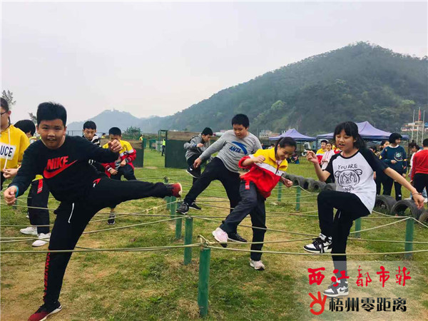 “百米障礙大挑戰”項目中,學生們跨過障礙物向終點進發。