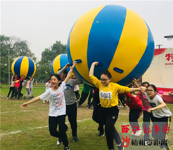 “運轉乾坤”項目中,學生們舉起大球全力沖刺。 另一邊賽場上,“百米障礙大挑戰”也在火熱進行中。134班學生胡明深高瘦的身影在賽場上一直來回穿梭,抱腿協助爬欄桿、托舉助力翻高墻、牽手共渡獨木橋,本來他可以快速地完成通關任務,但他總是第一時間伸出援手幫助稍微落后的隊友通關,隊友們都集體高呼他為“暖男”。