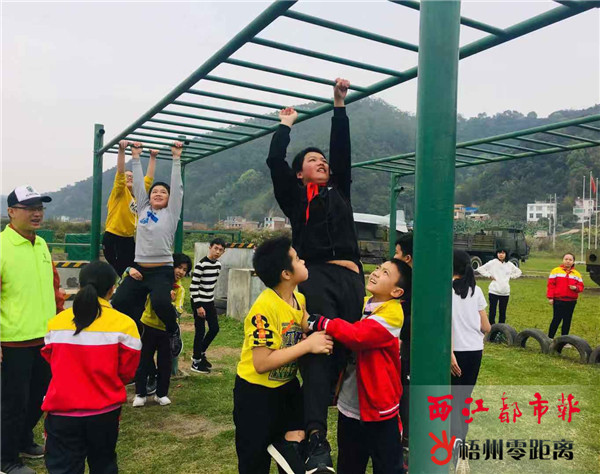 梧州零距離網-西江都市報訊 3月14日,梧州市工廠路小學六年級約300名學生在梧州軍博園開展軍體研學活動。此次軍體研學活動由梧州市萬秀區青少年活動中心和梧州軍博園聯合組織。據悉,萬秀區青少年活動中心將面向城區多所學校推廣梧州軍博園軍體研學線路,讓更多學子從中受益。今年,該中心將攜手梧州軍博園計劃推出十期軍體研學活動。 齊心協力迎挑戰 當天上午9時,工廠路小學的學生們分為五個研學縱隊,在軍博園教官的帶領下,精神抖擻地來到閱兵廣場舉行升旗儀式。在莊嚴的軍令狀宣誓儀式后,軍體研學活動正式開始。 在軍博園的星空草坪上,一場“運轉乾坤”大戲正在上演。據介紹,“運轉乾坤”需要五個人舉起充氣大球,原地轉圈六次,然后一起舉著大球接力沖刺才能獲取勝利。133班學生李宇思是第一小隊的隊長,在賽前的訓練時間里,由于第一小隊全部都是女生,且體態較為輕盈,她便根據隊員的身高來“排兵布陣”,個子稍高的隊員站前面和兩旁,個子稍矮的隊員站后面和中間。比賽開始了,隨著教官一聲令下,第一小隊以最快最強的爆發力取得了比賽勝利。隊員葉芮欣開心地分享道:“這個游戲既考驗團隊協調能力,也考驗隊員分工合作能力。我們隊今天的作戰策略就是聽從隊長的安排,齊心協力,最終贏得了比賽。”