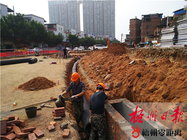 3月19日,在新湖一路北段,工人正在修筑排水管道沉井。