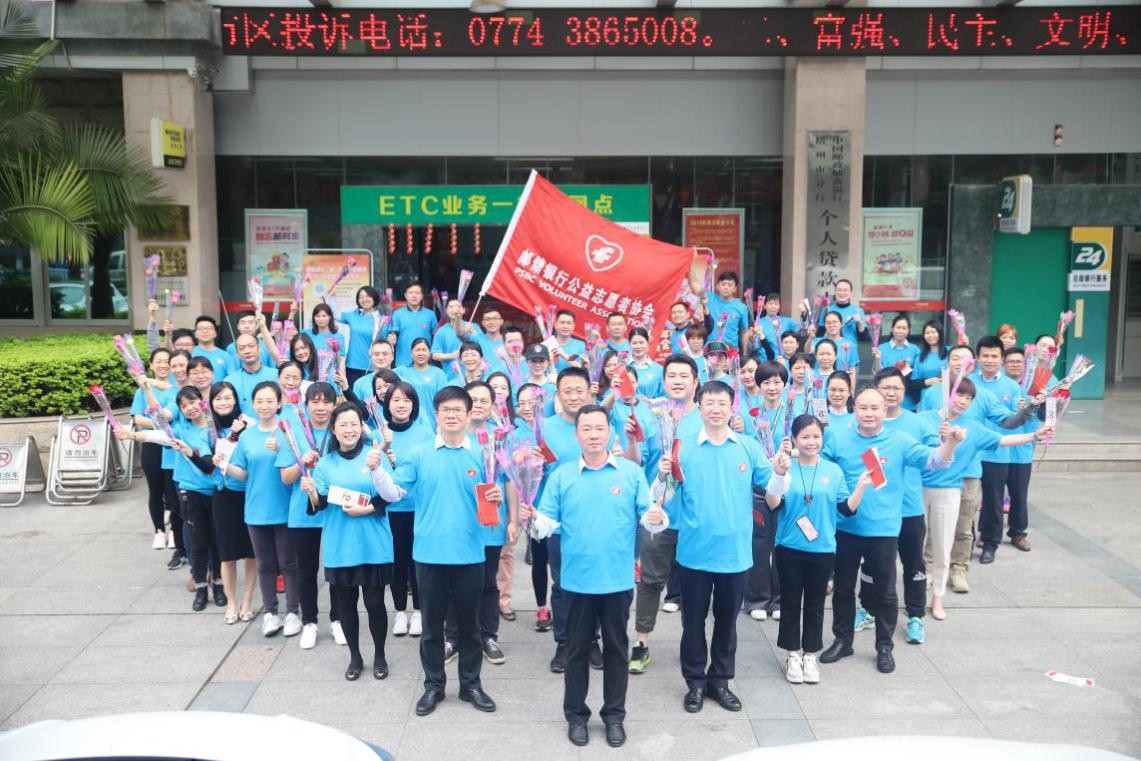 陽春布德澤,萬物生光輝,在這春暖花開的日子,有一群“藍精靈”活躍在郵儲銀行梧州市分行的門口,他們身穿印有“郵儲銀行公益志愿者協會”標識的T恤,佩戴“郵愛公益”Logo胸貼,手拿紅粉愛心玫瑰,聚合成一個大大的愛心。原來今天是3月20日,是中國郵政儲蓄銀行“郵愛公益基金”成立兩周年紀念日,郵儲銀行梧州市分行正舉行著以“喜迎建國70年,郵愛公益一起走”為主題的“郵愛公益健步走”活動啟動儀式。