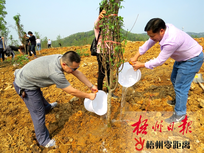 3月21日上午,藤縣林業(yè)局干部職工到藤州鎮(zhèn)麗新村大塘組開展義務植樹活動。當天,該植樹點共栽下桃花大苗100多株,種植面積約5畝。 王燁琳 攝