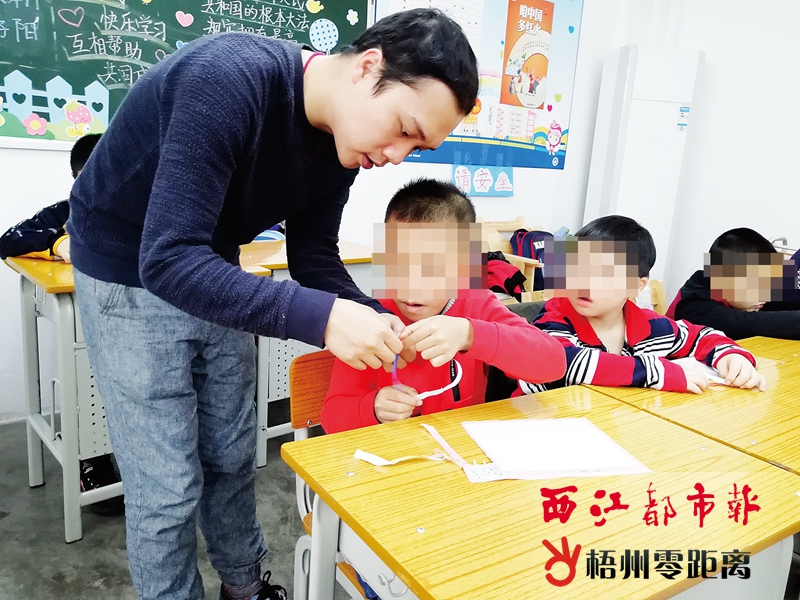在梧州市特殊教育學校,有這么一位老師,他用心教學,以愛感人,為身有殘疾的小朋友開啟一片光明的未來。他更在梧州市文明市民評選活動中,獲得了“文明市民標兵”稱號。他就是一年級語文老師李志亮。 李志亮是一個不折不扣的“90后”。2014年,李志亮初到特教學校,看著眼前這些身患殘疾但乖巧聽話的孩子,他感受到了自己肩上沉甸甸的責任,從那時起,他把更多了精力傾注在這些孩子身上,更深深地愛上了這個特殊的團體。為了能讓孩子們學會各種生活常識和語言基本知識,李志亮精心備課,以直觀形式由淺入深地帶領孩子們走進知識的殿堂。