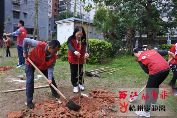 梧州零距離-西江都市報訊 (記者 紀榮蘭 通訊員 何少飛)3月29日上午,梧州市龍圩區城東社區黨委與社區“雙報到”單位、豐業龍湖春天小區物業部等,在龍湖春天小區內聯合開展“手植一棵樹,心系一片綠”植樹公益活動。