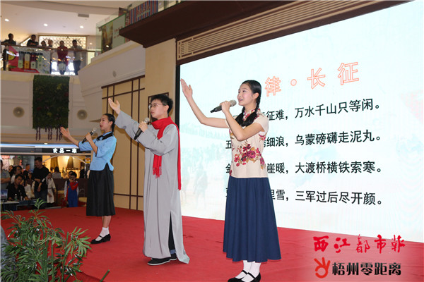 3月30日晚,朗誦者深情朗誦《長征》等經典詩詞作品。西江都市報記者 肖旻泰 攝 活動共分三個篇章,第一篇章為“踏青尋春,書香芬芳”,由一群身穿漢服的孩子們演繹《臨江仙》《破陣子》等古詩詞,吟唱出中國清明節的悠久歷史。而在第二篇章“尋歷史印記,做紅色傳人”中,朗誦者們飽含深情,用慷慨激昂的語調講述了烈士秋瑾的生平故事、狼牙山五壯士的事跡,并吟誦了《沁園春·長沙》《長征》等經典詩詞,把觀眾的思緒拉回到那段崢嶸歲月。第三篇章為“感恩前行,逐夢奔跑”,以《祝酒歌》歌頌朝氣蓬勃、戰天斗地的小興安嶺伐木工人,以《錢學森回國》致敬中國航天事業之父錢學森,一首首現代詩描繪出砥礪奮進的新時代光景。 晚會利用舞臺LED屏上畫面的變幻,輔以音響的配合,營造出良好的現場氛圍,在篇章之間還引入古風民俗舞蹈作為銜接,讓節目更具層次感和觀賞性。萬秀區委宣傳部部長鐘燕萍表示,本次朗誦活動是萬秀區進一步弘揚傳統文化、堅定文化自信、抓好意識形態的一項舉措,以朗誦形式生動演繹中華民族厚重的歷史文化,希望能進一步深化“書香社區”文化品牌、弘揚中華優秀傳統文化,為迎接新中國成立70周年營造濃厚氛圍。