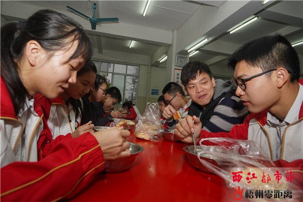 梧州零距離網-西江都市報訊 (記者 朱元冬 通訊員 黎園)“今天的瘦肉粥味道如何”“牛腩粉的湯不夠可再加一些”,3月27日早上7點,梧州市第十五中學黨總支書記張容海一邊跟學生們一起吃早餐,一邊向他們了解早餐的口味、分量等情況。 在十五中的食堂內,記者看到,食堂工作人員統一穿戴白色的衣帽和藍色圍裙,并戴上口罩和手套進行早餐的分發。學生們有序地排隊領取早餐,盛裝早餐的不銹鋼碗和勺子也由校方提供。 當天,除了張容海跟學生們一起用餐,現場一起用餐的還有該校總務處副主任李青洪和其他老師,他們邊吃早餐邊向學生了解早餐的情況,收集到的意見和建議用于食堂伙食的進一步改進。