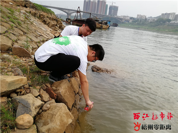 志愿者在桂江邊對河水進行取樣。(朱元冬攝) 河岸附近的居民黃麗說:“我對大學生保護桂江的行動十分贊賞,我本身是一名冬泳愛好者,大學生的環保行動很有意義。” 梧州市萬秀生態環境局局長黃英武也積極投身到此次活動中來,他表示,大學生保護母親河的行動是梧州水源地環境保護的一個重要舉措,所檢測到的水質數據具有參考價值。今后生態環境部門將繼續在各中小學校加強宣傳,號召更多的人一同保護水資源。