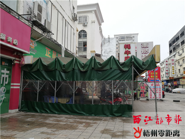 梧州零距離網(wǎng)-西江都市報訊(記者 吳艷虹 實(shí)習(xí)生 賴陽云)日前,網(wǎng)友“hsw713”在梧州零距離問政平臺反映,位于紅嶺路的福興時代商業(yè)廣場存在亂搭亂蓋現(xiàn)象,不少商戶搭建了伸縮遮陽棚;南方電網(wǎng)公司旁有一間違建房屋,希望有關(guān)部門加強(qiáng)整治。就網(wǎng)友反映的情況,3月28日,記者到福興時代商業(yè)廣場走訪。 記者從北門進(jìn)入,只見道路兩側(cè)商鋪林立,部分商鋪存在亂搭亂蓋現(xiàn)象。其中,距離北門約50米的一家飯店,店面門檻處往外搭建了一個2米多長的伸縮遮陽棚,橫向占據(jù)人行道,棚內(nèi)擺放著坐椅、煤氣罐、煤氣爐等;距離北門約100米的一家飲食店門前,同樣占道搭建了一個綠色鐵質(zhì)伸縮遮陽棚。 在距離北門約200米處,南方電網(wǎng)公司辦公點(diǎn)旁邊有一間新建保安崗?fù)ぃ瑣復(fù)づ杂幸蛔陆ㄆ椒浚F皮棚從屋頂延伸至房前2米的空地上。經(jīng)了解,該平房為福興物業(yè)提質(zhì)辦公室,建于去年。福興物業(yè)提質(zhì)辦公室主任鐘先生表示,該平房因保護(hù)地下消防用水泵而建。