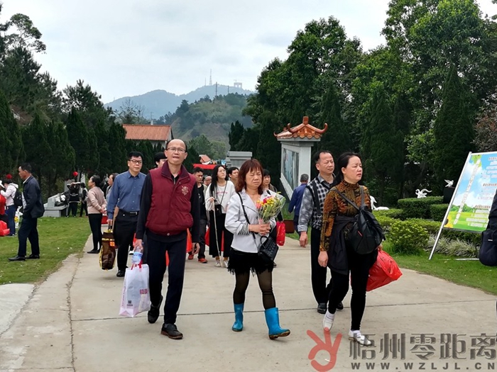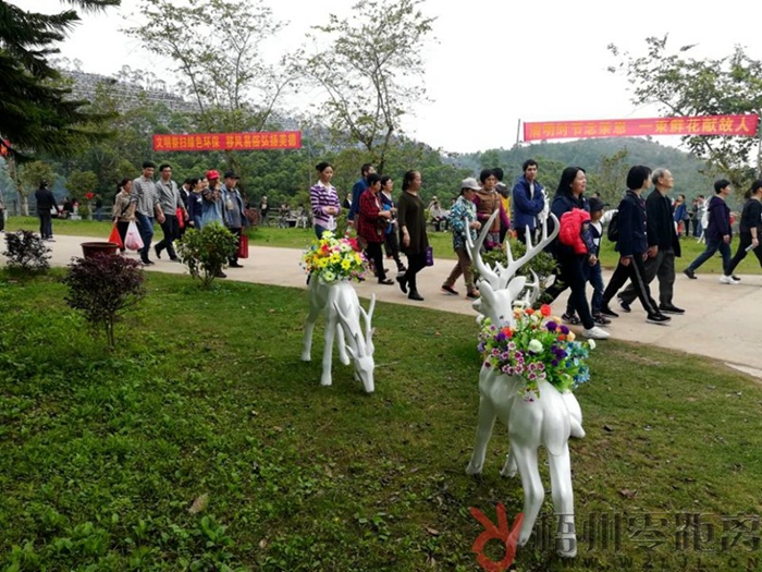 市民攜帶鮮花等物品進園祭掃。 仙風山墓園業主單位梧州市祥和實業有限公司經理鄧宇告訴記者,近年來市民都傾向于錯峰祭祀,不再集中在某一天或某一時段進行祭掃。以清明節當天為例,早上7時就有市民進園祭掃了,“雖然清明節全天的人流量仍是一年當中最高的,但不會出現非常擁擠的情況,各時段的人流量比較平穩。”鄧宇說。根據仙風山墓園初步統計,清明節當天祭掃人數超過5萬人。 當天,記者發現仙風山墓園內道路增設了綠化帶和動物雕塑群組,栩栩如生的動物雕塑還吸引了不少市民特別是小朋友駐足合影。鄧宇表示,為配合自治區民政廳發起的“綠色清明”主題宣傳,仙風山墓園通過動物雕塑、鮮花裝飾等營造綠色祭祀的環境氛圍。同時,為減少爆竹的燃放,墓園工作人員組成巡查隊,分別進入墓區巡邏,一旦見到有燃放爆竹的現象,會立即進行勸導。