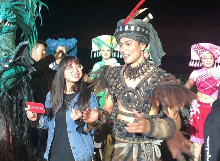 值得一提的是,此次出任舞美設(shè)計(jì)的高廣健先生,正是享譽(yù)世界的歌劇《圖蘭朵》的舞美設(shè)計(jì),如此高咖位的藝術(shù)家,他所打造的《花山》絕對(duì)能讓你驚艷。 當(dāng)然,零妹覺得最印象深刻的就是實(shí)景劇里的男主角,他養(yǎng)的小土狗也與他一起出演舞臺(tái)劇,帥哥配小狗,十分暖心,看得周圍的妹子眼里冒起了小星星,女觀眾們紛紛與實(shí)景劇《花山》的男主合影留念。