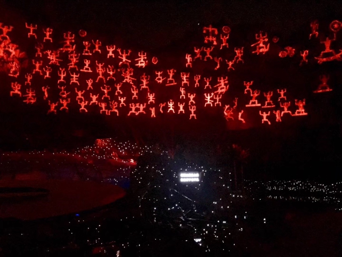 大型壯族神話實(shí)景劇《花山》是一臺(tái)以花山巖畫的山體、河流等自然景觀為舞臺(tái)背景,結(jié)合壯觀的多媒體舞臺(tái)視覺特效,呈現(xiàn)出壯族先人繁衍生息,守護(hù)家園,與化作水怪的洪災(zāi)惡魔斗爭(zhēng),一代又一代的人的奮斗與犧牲,還有那永恒的主旋律——愛情與親情,等一系列故事的演出,為觀眾帶來一場(chǎng)難忘的觀劇體驗(yàn)。