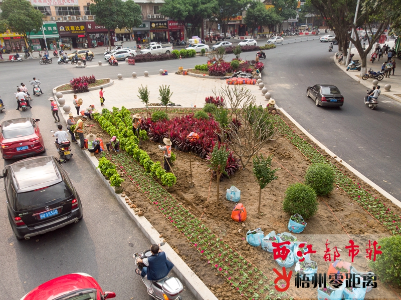 4月8日,位于新興二路西環路路口處的渠化島輪廓初現,中鐵一局的施工人員正在給渠化島種上綠植。